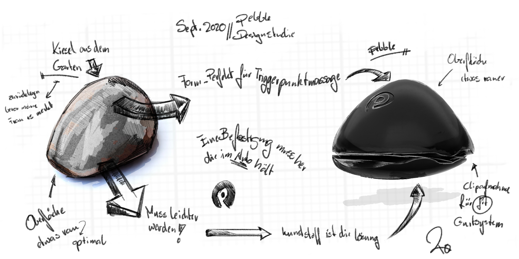 Die Form und Beschaffenheit eines Kieselsteins war die perfekte Basis für die Entwicklung der pebbles. Zahlreiche Tests mit Prototypen haben zu der finalen Form geführt. Variabel in der Intensität durch 3 verschiedene Größen, Einfach zu handeln, Stabil und ohne Schnickschnack!